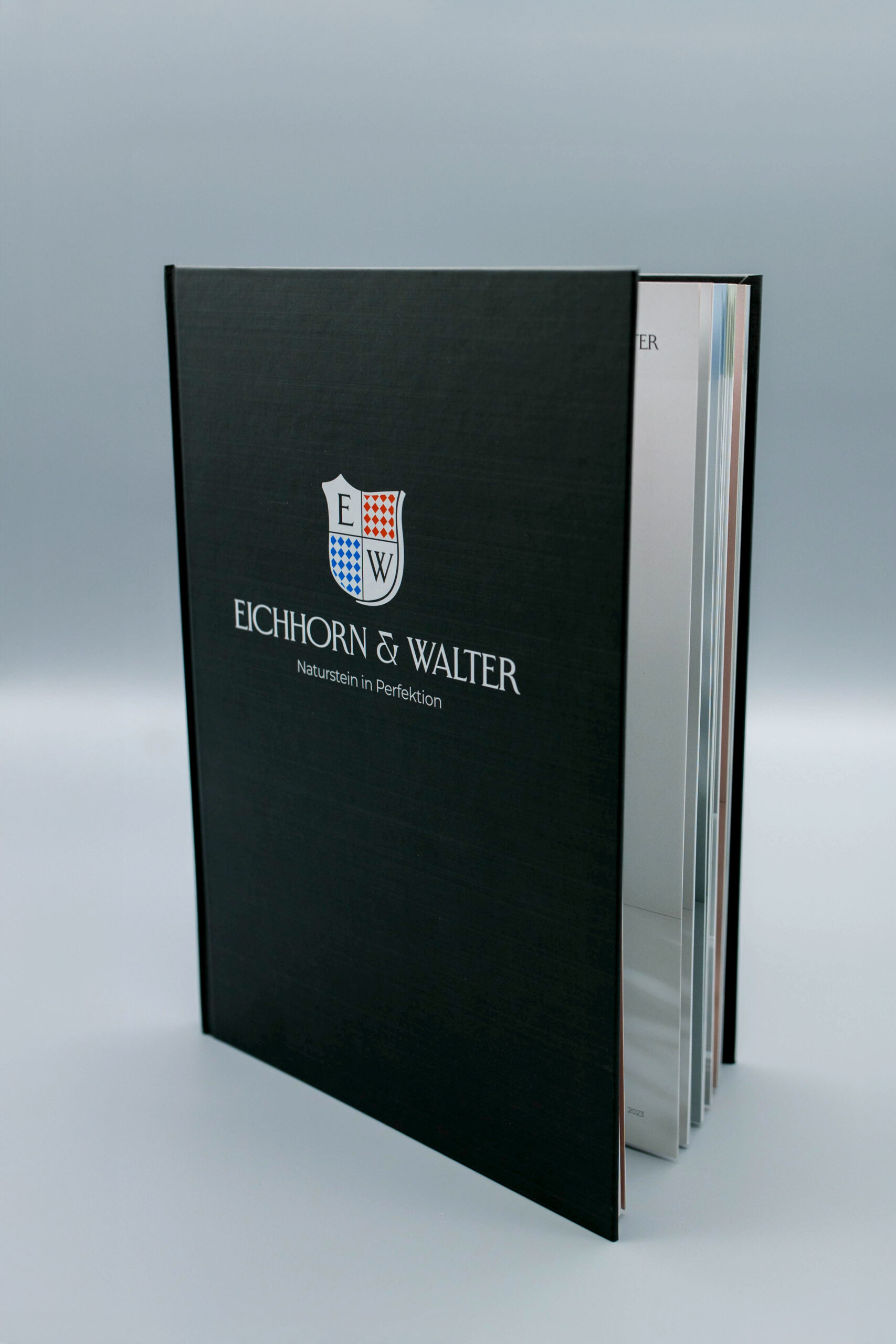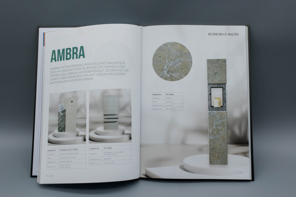 Für Eichhorn & Walter Natursteine haben wir einen hochwertigen Produktkatalog für Grabsteine im A4-Hochformat realisiert. Der 128-seitige Hardcoverkatalog wurde 4/4-farbig im Offsetdruck produziert und zeigt die Natursteinmodelle in brillanter Bildqualität auf 150 g Bilderdruck matt.